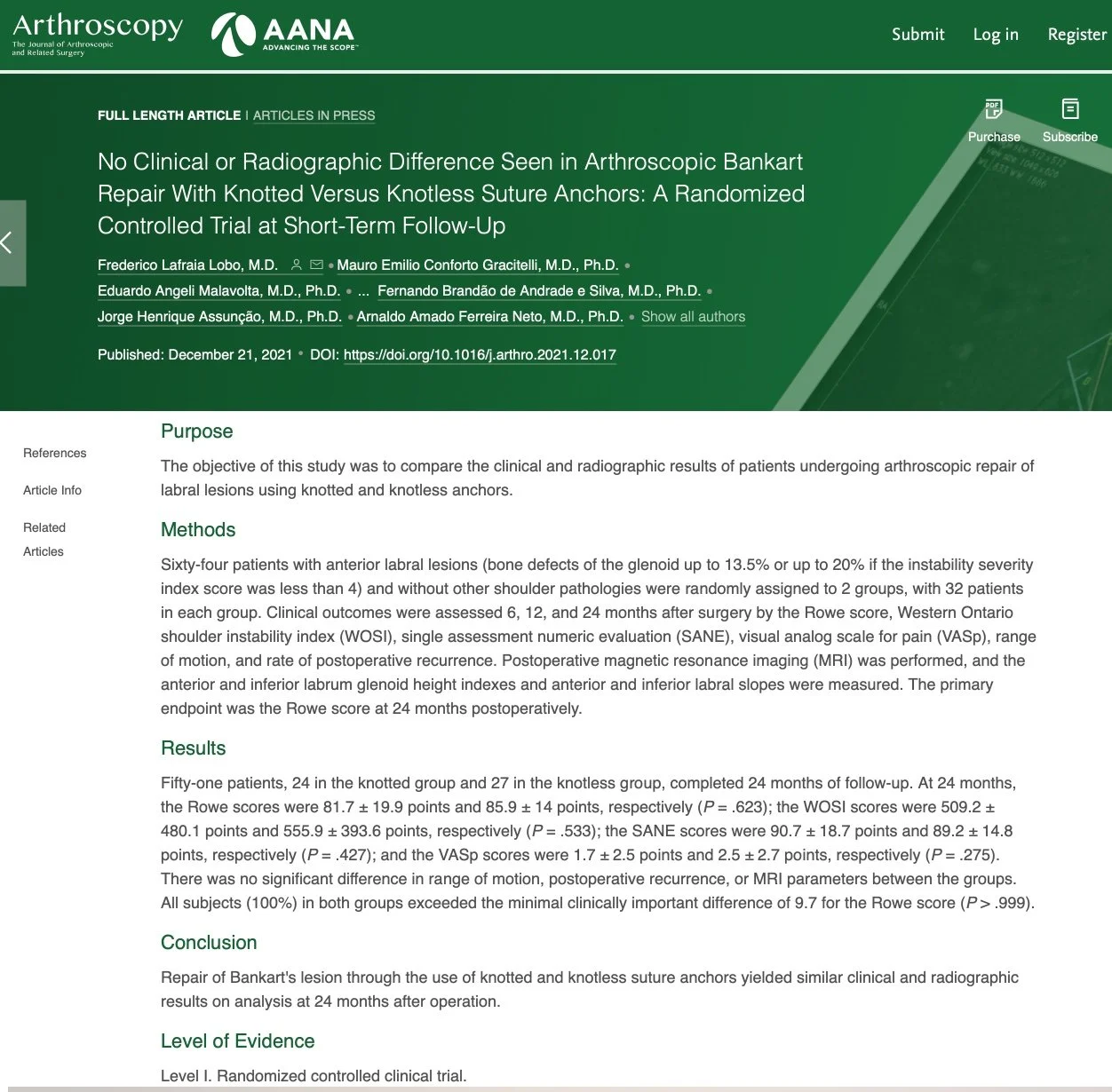 Nesse estudo randomizado e controlado, publicado na revista Arthroscopy, comparamos o tratamento cirúrgico com dois modelos diferentes de âncoras: com e sem nó. Demonstramos resultados satisfatórios com ambos os modelos, sem diferença nas escalas funcionais e na avaliação por ressonância magnética pós-operatória
