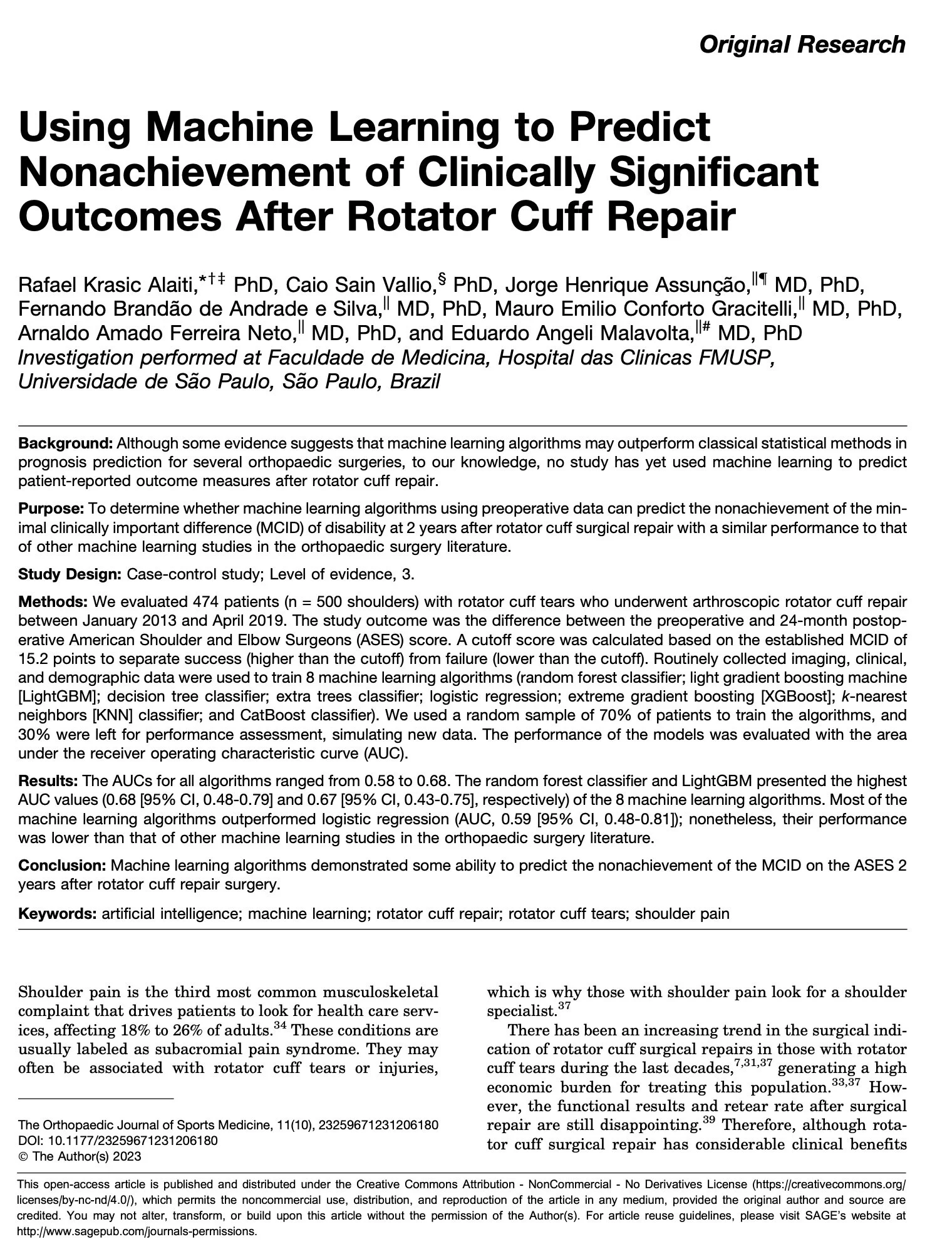 Este estudo, publicado na Orthopaedic Journal of Sports Medicine, explorou o uso de algoritmos de machine learning para prever a não obtenção da diferença clinicamente importante mínima (MCID) na pontuação de incapacidade após 2 anos do reparo cirúrgico do manguito rotador. Avaliando 474 pacientes (500 ombros) submetidos ao procedimento entre 2013 e 2019, os algoritmos foram treinados com dados clínicos, demográficos e de imagem para prever o resultado com base na diferença entre as pontuações pré e pós-operatórias do American Shoulder and Elbow Surgeons (ASES).
