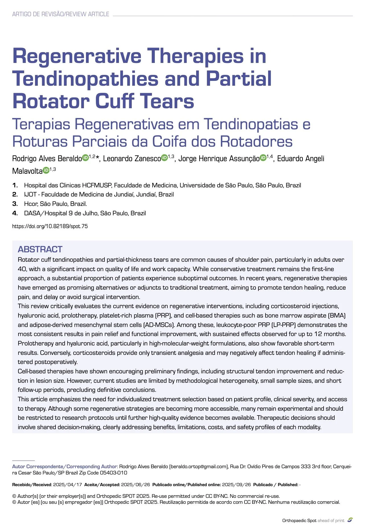 Revisar criticamente as evidências atuais sobre o uso de terapias regenerativas — como plasma rico em plaquetas (PRP), ácido hialurônico, proloterapia, corticosteroides e terapias celulares — no tratamento conservador das tendinopatias e rupturas parciais do manguito rotador.