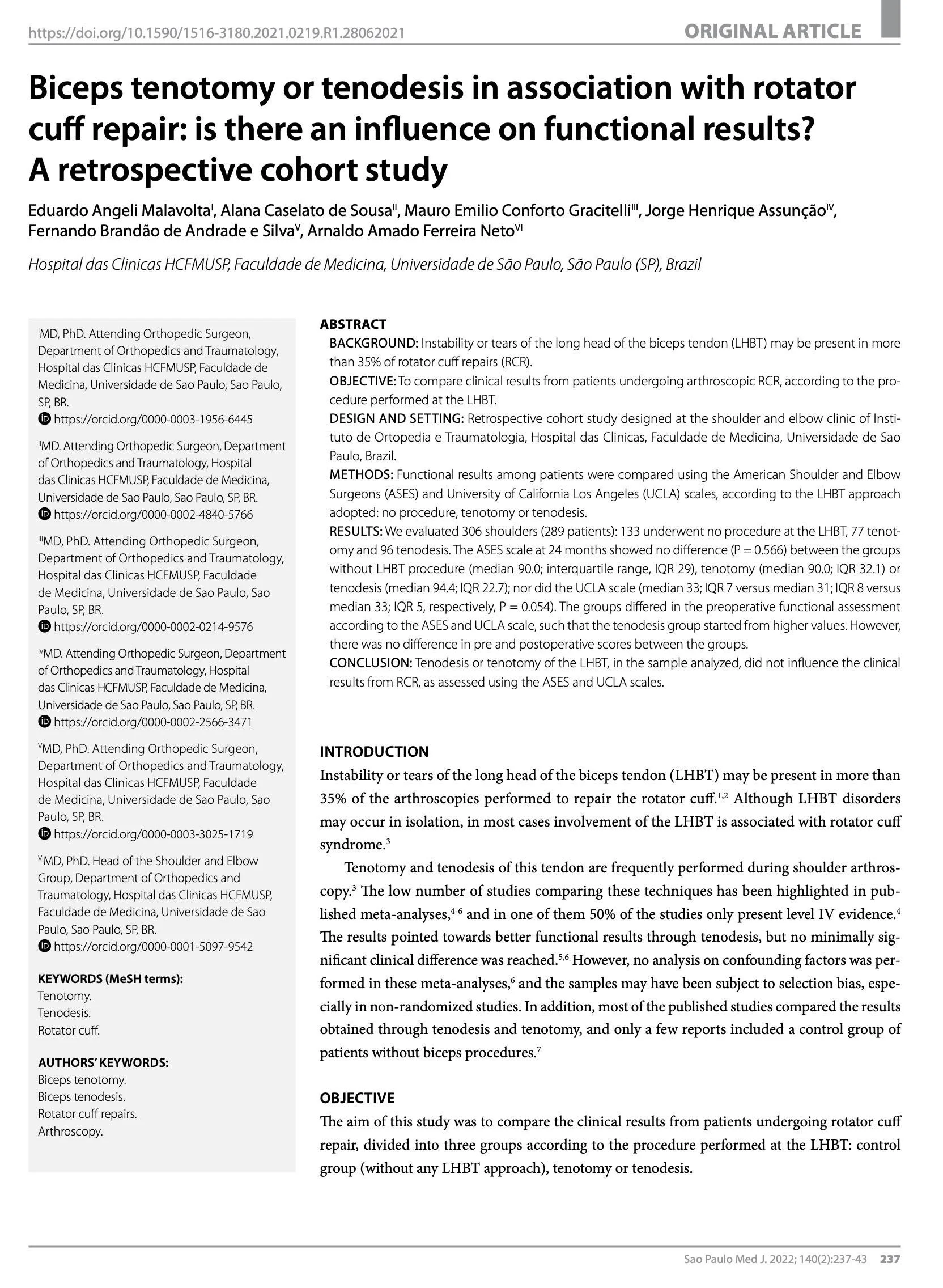 Nesse estudo, publicado na revista São Paulo Medical Journal, avaliamos a associação do tratamento do bíceps com o reparo do manguito rotador. Concluímos que não houve diferença estatisticamente significante quanto aos resultados funcionais pós-operatórios.